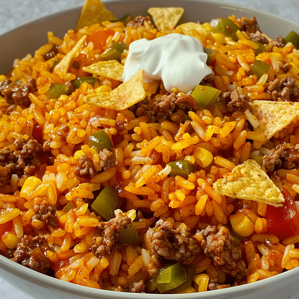 This Taco Rice Bowl with Doritos combines all your favorite taco flavors into a quick, layered meal. With seasoned beef, fluffy rice, crunchy Doritos, and your favorite toppings, it’s perfect for taco night with a twist!