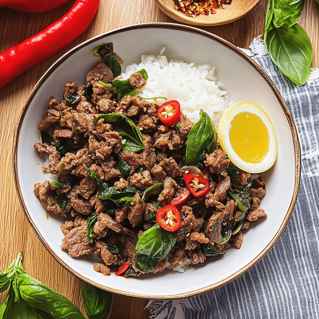 Thai Basil Beef, also known as Pad Kra Pao, is a spicy, savory, and aromatic stir-fry dish made with ground beef, garlic, chilies, and fresh Thai basil. This dish is quick, easy, and packed with bold flavors, making it a perfect weeknight meal. Serve it over steamed rice with a fried egg for an authentic Thai experience!