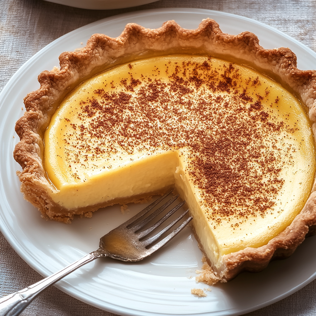 A classic vanilla custard pie with a silky-smooth filling and a buttery pie crust, offering a rich and comforting dessert perfect for any occasion.