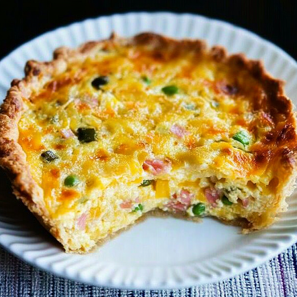 - Assemble the quiche: Spread ham, sautéed veggies, and shredded cheese evenly into the crust. Pour egg mixture over the top.