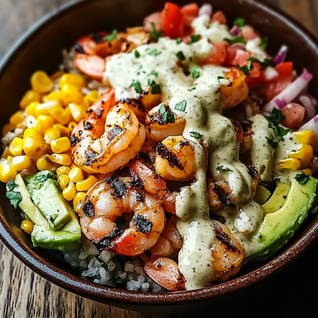 A vibrant and delicious grilled shrimp bowl topped with a refreshing avocado corn salsa and drizzled with a creamy, zesty sauce. Perfect for a healthy and satisfying lunch or dinner.